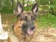 Окрас чепрачный с рыжим подпалом, на шее черный противоблошиный ошейник.
