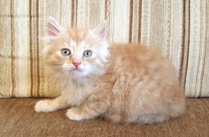 Красавчик-карапузик, пушистый малыш с нежной шерсткой, даже не рыжий, а скорее персиковый, веселый, как солнечный зайчик. Игривый, как все малыши, деловой, любопытный шалунишка, умеет ловить плюшевых мышек и громко петь песенки на ручках. Будет настоящий Рыжий Кот, когда вырастет, а пока еще маленький.
