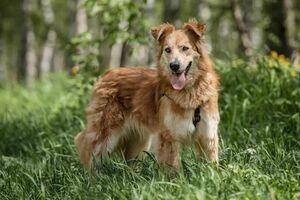 Лея — яркая, рыжая, пушистая красавица. Метис колли.