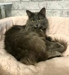 Москва. Мушке полтора года, она очень умная, красивая и игривая кошка. Фенотип русской голубой или нибелунга. Жила в подвале дома в центре Москвы с 2 братьями и мамой. Обработана от паразитов, стерилизована. Пользуется лотком и когтеточкой, ест сухой и влажный корм. Мушка — ласковая, мурчливая кошка, очень любит общаться с людьми. Умеет делать цирковые перекаты на земле, словно цирковая артистка.
