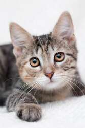Ну вот, да, если вы хотели полосатого котёнка, их есть у нас и сразу трёхцветный — на счастье!