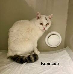 Москва. Ищет дом бывшедомашняя кошка Белочка. У Белочки необычный окрас — белая шубка и пушистый серебристый хвост. Почему Белочка оказалась на улице и как вышло, что ей пришлось побираться у храма, неизвестно. Из-за человеческого предательства кошечка перестала доверять людям, ей очень нужен терпеливый и любящий хозяин.